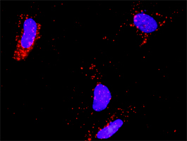 Detection of human E2F2 by immunocytochemistry using a proximity ligation assay (protein-protein interaction). Sample: HeLa cells. Primary antibodies: Anti-E2F2 Rabbit pAb (Cat. No. DR1095) (1:1200) and an Anti-E2F2 Mouse mAb (1:50). Detection: fluorescence using Duolink® 30 Detection Kit 613 (Red) and DAPI (blue) counterstain.