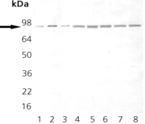 Detection of Hsp90 by immunoblotting. Samples: Native human Hsp90 protein (lane 1), recombinant human Hsp90β protein (lane 2), recombinant human Hsp90α protein (lane 3), whole cell lysate from heat shocked HeLa cells (lane 4), heat shocked 3T3 cells (lane 5), heat shocked PC-12 cells (lane 6), heat shocked CHO-K1 cells (lane 7), and heat shocked Rat-2 cells (lane 8). Primary antibody: Anti-Hsp90 Mouse mAb (AC88) (Cat. No. 386040) (1:1000). Detection: chemiluminescence.