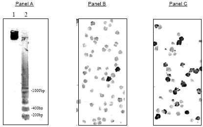 Agarose gel electrophoresis of DNA isolated from promyelocytic leukemia cells (HL60) induced to undergo apoptosis with 0.5 µg/ml actinomycin D (lane 2). DNA from control (untreated) HL60 cells is present in lane 1. Panels B and C: TdT-FragELTM staining of HL60 cells induced to undergo apoptosis with 0.5 µg/ml actinomycin D (Panel C). Control (untreated) cells are shown in Panel B.