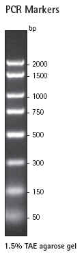 PCR Markers are a mixture of eight defined DNA fragments ranging from 50 to 2000 bp at convenient size intervals for characterizing small DNA products.