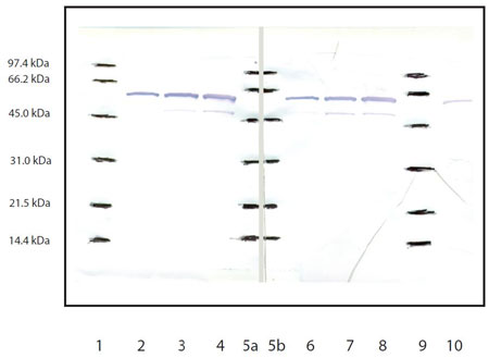 Detection of human catalase by immunoblotting. Samples: Low molecular weight markers (lanes 1, 5a, 5b, 9), catalase protein (0.075 µg) (lanes 2 and 6), catalase protein (0.15 µg) (lanes 3 and 7), and catalase protein (0.3 µg) (lanes 4 and 8), and red blood cell lysate (lane 10). With primary antibody dilution 1:8000 (lanes 1-5a) and 1:6000 (lanes 5b-10). Primary antibody: Anti-Catalase Rabbit pAb (Cat. No. 219010) (1:6000). Detection: chemiluminescence.