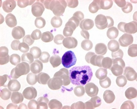 Identity (UV/VIS-Spectrum)passes testLoss on drying (105 °C)≤ 10 %Suitability for microscopy (Blood smear)passes testNucleivioletLymphocytes (Plasma)blueMonocytes (Plasma)grey bluebasophilic granulocytes (Granules)dark violeteosinophilic granulocytes (Granules)reddish to red-brownNeutrophilic granulocytes (Granules)red-violetThrombocytesvioletErythrocytesreddish-brownishBlood parasites (Nuclei)lightred