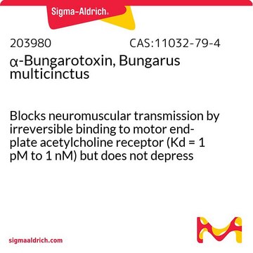 α-Bungarotoxin, Bungarus multicinctus, Blocks neuromuscular transmission by irreversible binding to motor end-plate acetylcholine receptor (Kd = 1 pM to 1 nM) but does not depress acetylcholine release from motor nerve endings.