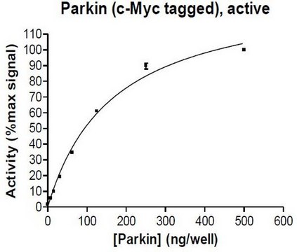 Parkin (c-Myc tagged) Protein, active, 10 µg, Active, full length, recombinant human Parkin. N-terminal c-Myc, 6His-tagged. For use in Enzyme Assays. Functions as an E3 ligase in ubiquitination assays.