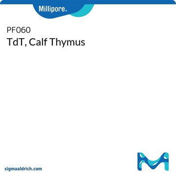 Native TdT from calf thymus. Tdt is a DNA polymerase that catalyzes the addition of deoxynucleotides to the 3′ hydroxy terminus of either double of single stranded DNA in a template-independent manner.