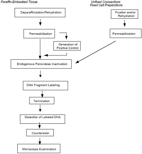 • This protocol is similar to FragEL™ of paraffin-embedded tissue sections EXCEPT that the deparaffinization step is replaced with a short hydration step and permeabilization with proteinase K is performed for only 10 min. Fixation of cryopreserved tissue is required prior to performing the assay.