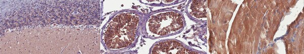 Immunohistochemistry Analysis: A 1:250 dilution from a representative lot detected DNM1L in human cerebellum, human testis, and rat skeletal muscle tissue sections.