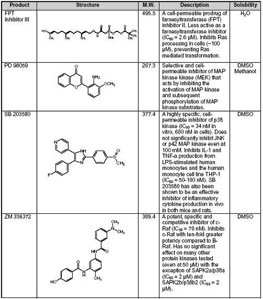 More>> The MAP Kinase Cascade Inhibitor Set controls the biological activity of MAP Kinase Cascade. This small molecule/inhibitor is primarily used for Phosphorylation & Dephosphorylation applications. Less<<Recommended Products
