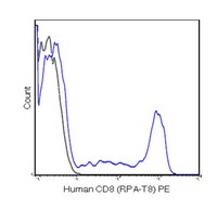 The RPA-T8 antibody is specific for the 32-34 kDa alpha chain of human CD8, known as CD8a or CD8 alpha. CD8a can form a homodimer (CD8 alpha-alpha), but is more commonly expressed as a heterodimer with a second chain known as CD8b or CD8 beta. CD8 acts as a co-receptor for antigen recognition and subsequent T cell activation that is initiated upon binding of the T cell receptor (TCR) to antigen-bearing MHC Class I molecules. The cytoplasmic domains of CD8 provide binding sites for the tyrosine kinase lck, facilitating intracellular signaling events that lead to T cell activation, development, and cytotoxic effector functions. CD8+ cytotoxic T cells (CTLs) play an important role in inducing cell death of tumor cells, as well as cells infected by virus, bacteria or parasites.The RPA-T8 antibody is widely used as a phenotypic marker for CD8 on cytotoxic T cells, thymocytes, as well as on certain cell types that do not also express the TCR, including some NK cells and lymphoid dendritic cells. It is cross-reactive with CD8 in several non-human species, including Baboon, Chimpanzee, Cynomolgus and Rhesus. If used together with an alternative Anti-Human CD8a clone, Hit8a, the RPA-T8 antibody will not block binding of Hit8a to CD8a.