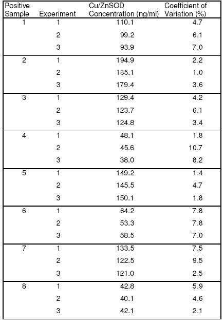 | Kit contains | Pre-Coated 96-Well Plate, Anti-Cu/Zn SOD/HRP-Conjugate, Cu/Zn SOD Standard, Wash Buffer Concentrate, Assay Buffer Concentrate, Phosphate Buffered Saline, Substrate Solution, Stop Solution, Plate Covers, and a user protocol. |