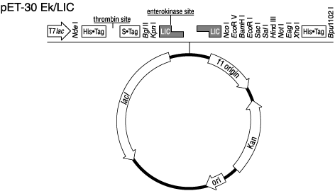 OverviewThe pET-30 Ek/LIC vector is an Ek/LIC version of pET-30b(+). It is designed for cloning and high-level expression of target proteins fused with the His•Tag® and S®Tag™ coding sequences that are cleavable with enterokinase (Ek) protease. The plasmid contains a strong T7lac promoter, an optimized RBS, the coding sequence for the Ek protease cleavage site (AspAspAspAspLys↓), and a multiple cloning site that contains restriction enzyme sites found in many other Novagen expression vectors to facilitate insert transfer. An optional C-terminal His•Tag coding sequence is compatible with purification, detection, and quantification.