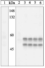 | Application Data | ![]() Detection of human JNK1 and JNK2, phosphorylated on Tyr183 and Thr185, by immunoblotting. Samples: Whole cell lysate from HEK293 cells left untreated (lane 1) or treated with UV irradiation (lanes 2-6). Primary antibody: PhosphoDetect™ Anti-SAPK/JNK (pTyr183,pThr185) Rabbit pAb (Cat. No. 559309) (1:1000) pre-incubated without peptide (lanes 1,6) or with immunogen phosphopeptide (lane 2), a generic phosphothreonine-containing peptide (lane 3), a generic phosphotyrosine-containing peptide (lane 4), or non-phosphopeptide corresponding to the immunogen (lane 5). Detection: chemiluminescence. |